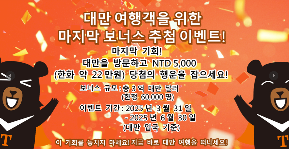 - 🎟️ 대만 전자 바우처 제공 – 공항 도착 시 무작위 추첨 방식으로 지급 (최대 NT$5,000 상당)
