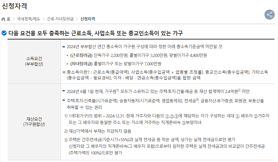 근로장려금 신청자격을 갖추려면 단지 ‘소득이 낮다’는 것만으로는 부족하며, 재산과 소득 모두 일정 기준 이하여야 한다는 점을 꼭 명심해야 합니다.