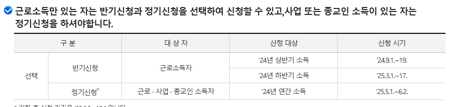 단, 반기 신청은 사업소득자나 종교인소득자는 신청할 수 없으며, 정기 신청만 가능합니다.